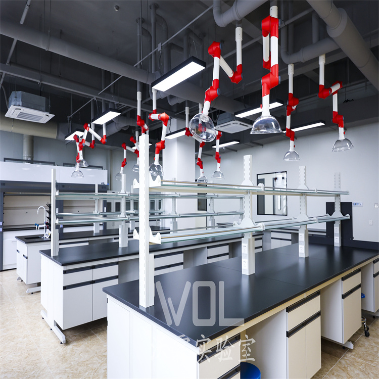 核心配置:每工位配实芯理化板实验台(带导流槽)、万向抽气罩(风速 0.3-0.5m/s)、纯水接口与双电压电源;集中放置 5-10L 高剪切乳化机、小型搅拌釜、超声波分散仪等小试设备。