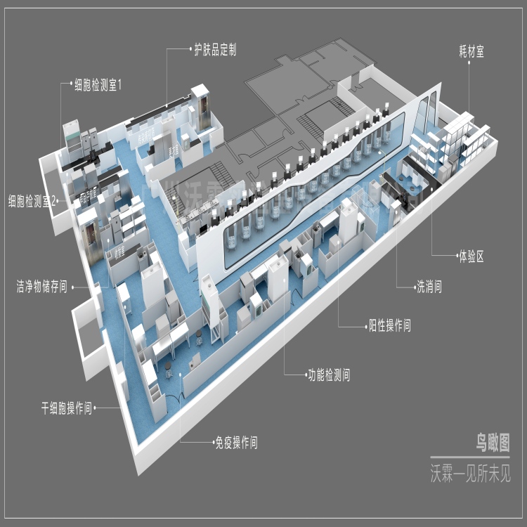1、实验区主要有:干细胞制备室、配液室、样本制备室、干细胞存储区、检验区、物料存储区、消毒清洗区、医疗垃圾暂存间,以及常见的缓冲、更衣室等。其中洗消间应标明洁净和风险等级。